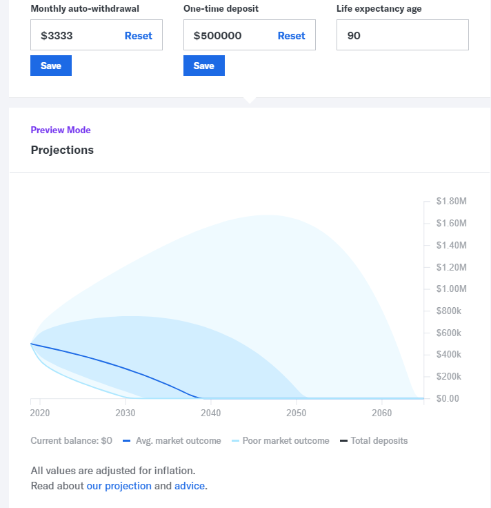 And here’s the same thing, except I did it in Betterment’s fun retirement income simulator, using a 95% stock portfolio. This version is slightly less optimistic, but still gets us out to almost 20 years in the most probable scenario.
