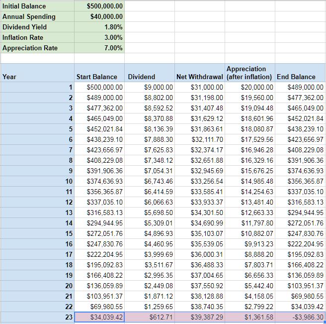 Small correction on the withdrawal rates. A $1.2 million starting amount is a 3.3% withdrawal rate. You’d need $1.33 million to have a 3% rate.