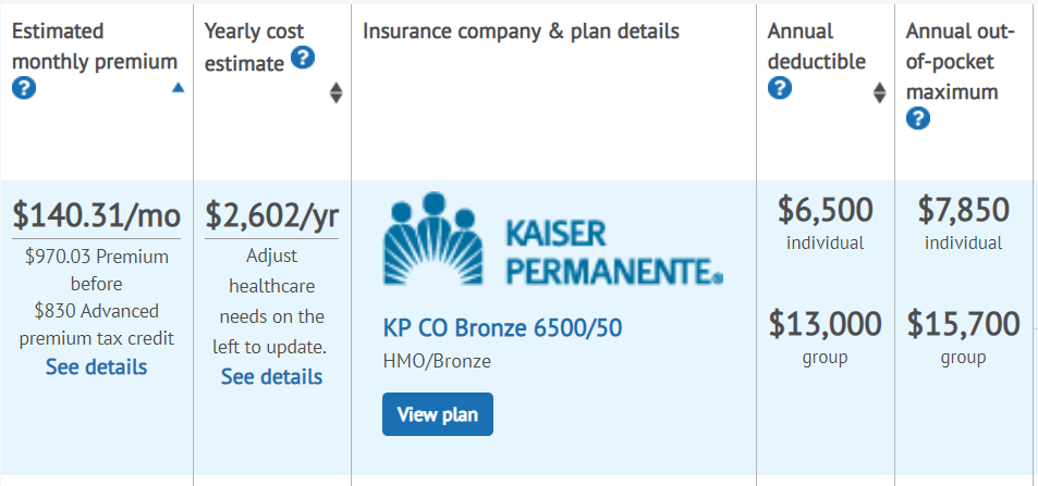 The good news is, the politically controversial Affordable Care Act actually handles this much better than most people assume. If I go to healthcare.gov right now (or in my case the Colorado-specific equivalent) and put in a hypothetical 4-person family with a $40,000 annual income in my zip code right now, I see this: