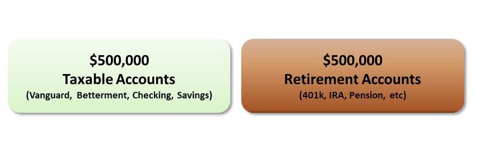 At this point, you will probably have at least two chunks of money: a normal chunk (also known as a taxable account), and a retirement chunk (perhaps a 401k, IRA, or pension).