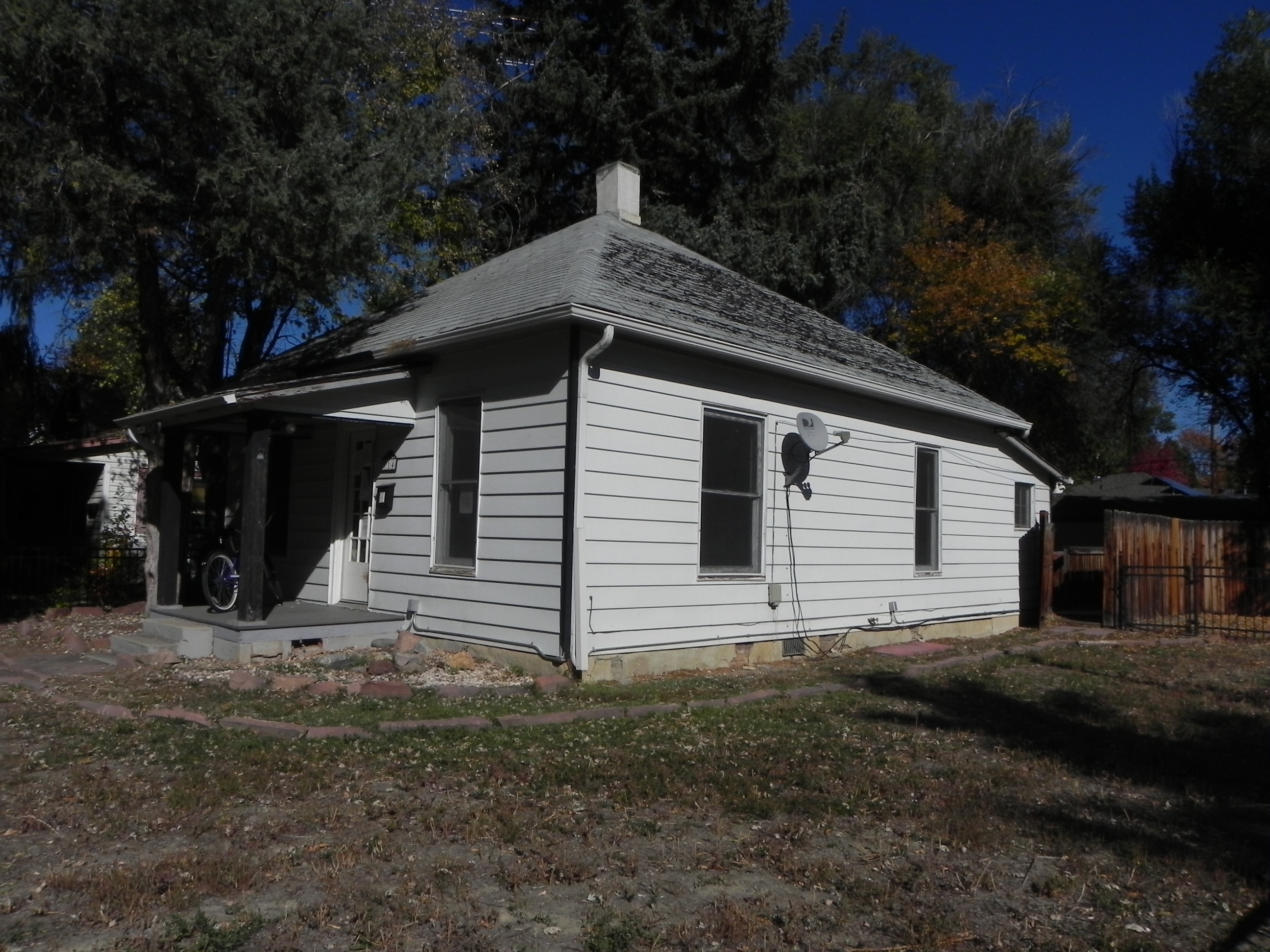 Old houses in poor condition usually have bad paint colors, with plenty of chips and stains in the finish. Ours had that, and it was also cursed with a bland white exterior. To complete the look, all exterior walls were completely plastered with hideous and unnecessary wiring and other barnacles: There was a Dish network antenna right on the street-visible South side. Plus TV, electric, telephone, and cable wires haphazardly spaghetti-ing around on every surface. With great pleasure, I ripped them all down before