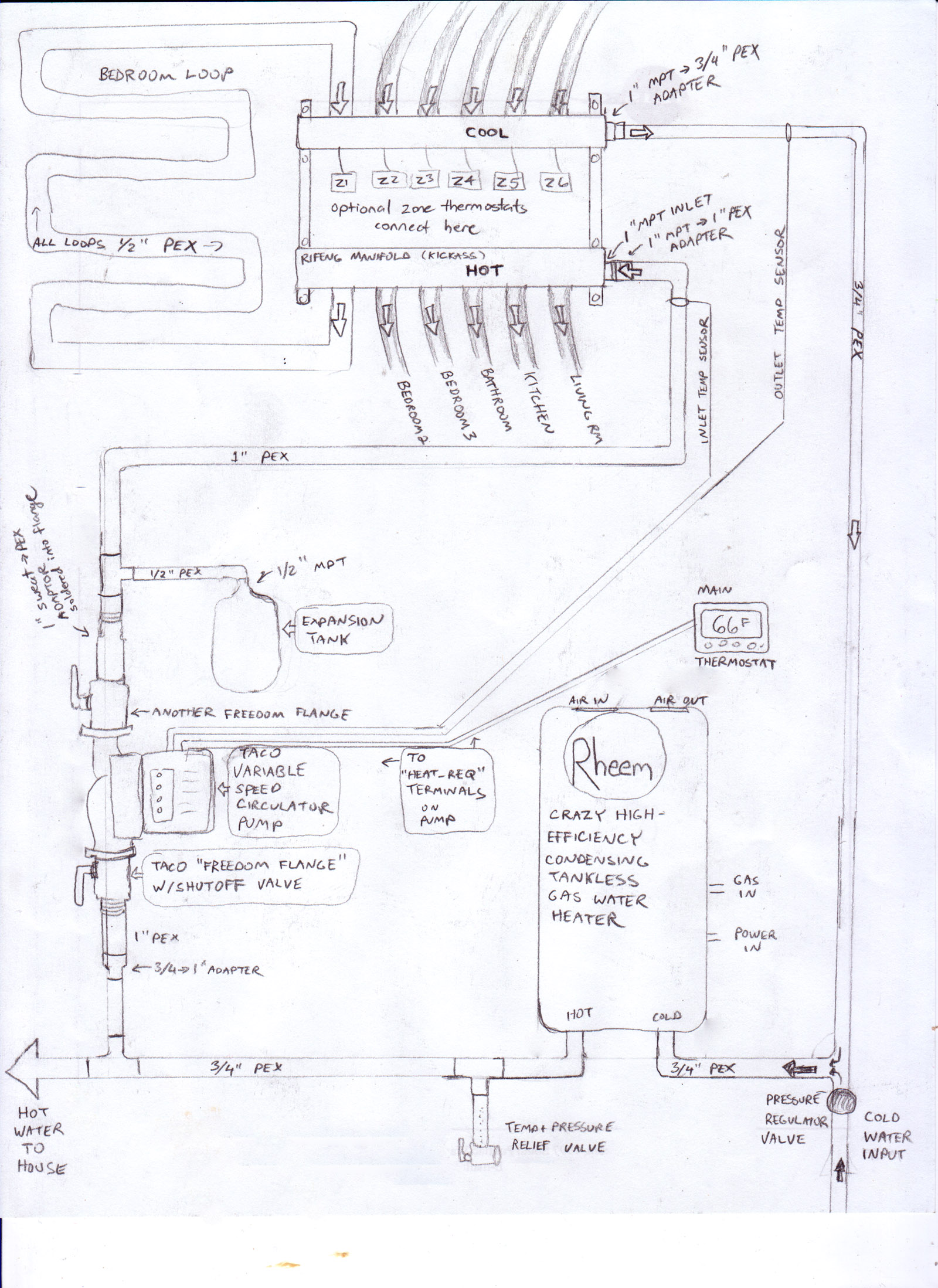 2. Using a single tankless water heater for both hot water and house heating cuts out the $2000-$4000 boiler cost. I chose this extremely efficient Rheem Tankless unit that runs only about $1200.