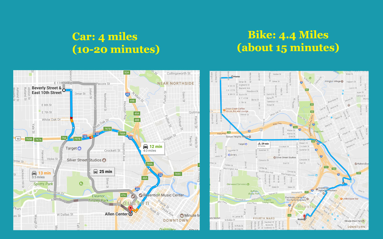I was disappointed to find this article isn’t about me. I too biked to work five days a week, 11 months of the year, as an attorney working in the Federal courthouse in Houston. I lived about 2.5 miles away in the Montrose area, and often the only slow-down in my commute was actually getting around the cars sitting in traffic to get onto bike paths along Buffalo Bayou. Considering I would park about .25 miles away on the odd-days I had to drive, biking wasn’t adding to my commute. I did it for two years relatively without incident (I was in one very minor crosswalk accident where a driver swerved around the car yielding to me crossing to hit me), and saved almost a grand a year. If the job had permanent, I probably would’ve just sold my car and used ride-sharing to save a few more thousand dollars a year.