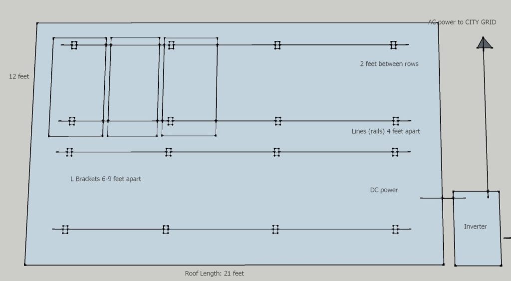 I needed two rails for each row of panels, and the rails get supported by “L”-shaped brackets bolted into the roof. So I ended up with this configuration:
