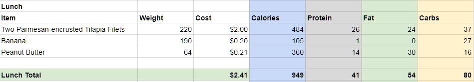 I may throw in a protein bar (30g protein, $1.00) to this snack, depending on the intensity of the work.