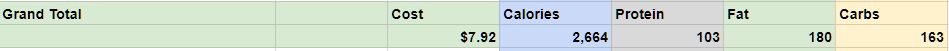 Although it took me quite a few hours to collect all this data on what I eat and add it up in a spreadsheet, the results have been quite interesting because I had never done it before. With just the stuff described above, I arrived at this point: