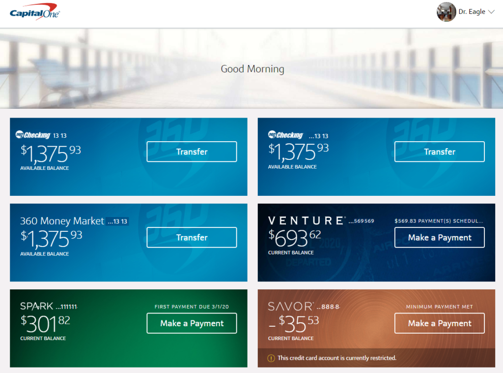 Lots of useful stuff on my capital one home screen (don’t worry, balances and account numbers, etc. have been modified for public sharing)